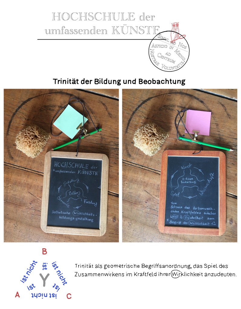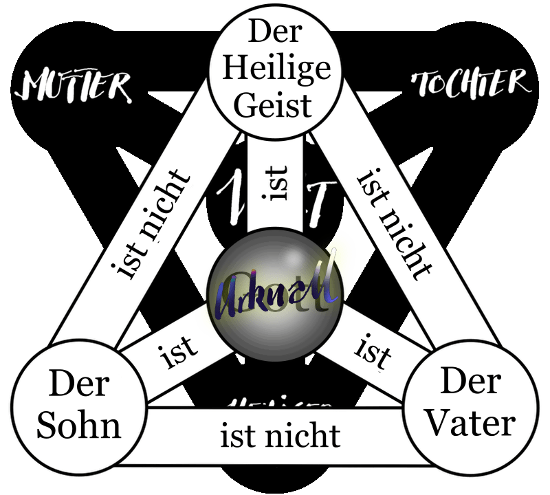 Die Tradition – aus der solch Gedanke stammt – begreift den Ursprung als Trinität und nennt ihn doch den Vater aller Dinge. Sie verschweigt dabei sein weibliches Pendant. Keine Schöpfung vermag aus einer Monade hervorzugehen. Der Keim unseres eigenen Versuchs möge also eine Dreifaltigkeit sein, die Dualitäten zu bilden in der Lage ist.